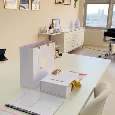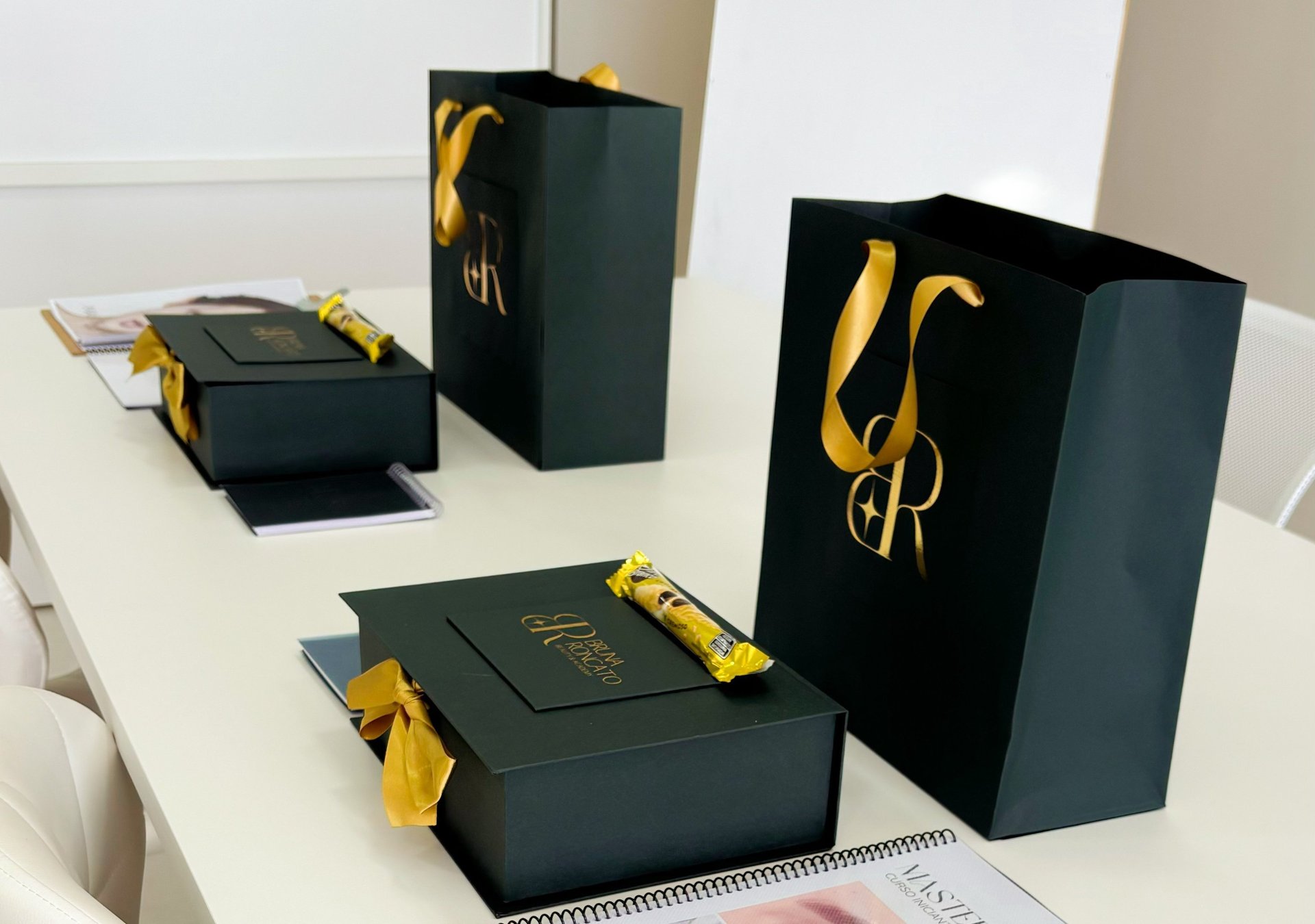 Kit Celebração: Nesta opção a aluna recebe a apostila, certificado, bloco de anotações e sacola personalizada com um mimo dentro para celebrar mais uma formação de sua carreira.