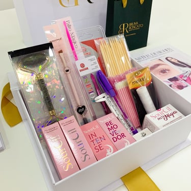 Kit Atendimentos: Nesta opção a aluna além de receber a apostila, certificado, bloco de anotações, sacola personalizada e caixa personalizada, também recebe: Mini Kit de Brow Lamination - Stella Milano com passo 1, 2 e 3; Plástico filme; 5 escovinhas de brow lamination; 5 lâminas; 50 lipgloss.
